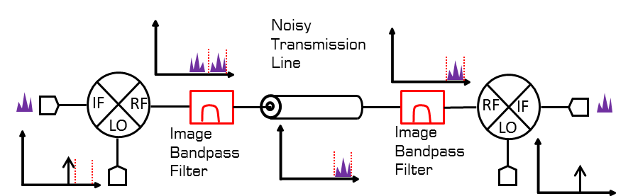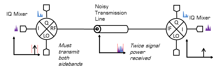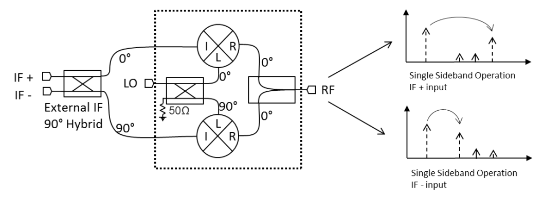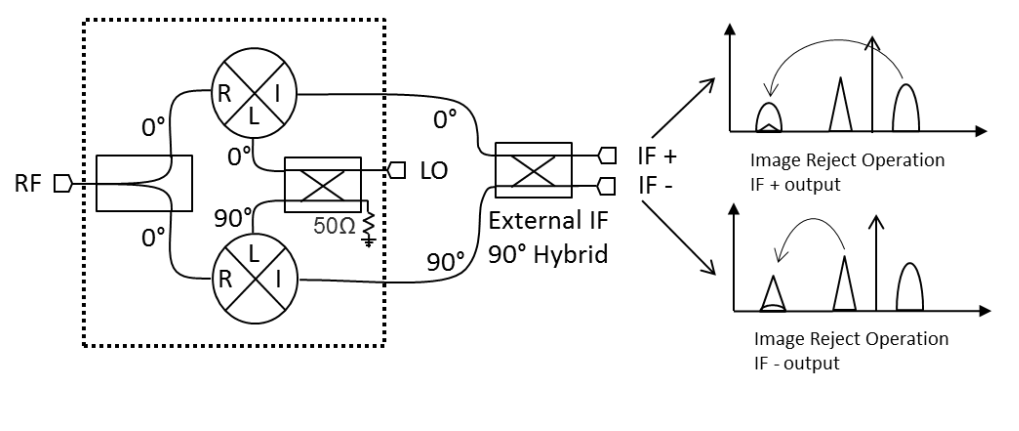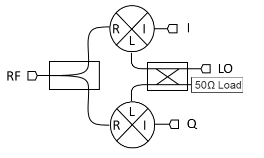 IQ混頻器與常規(guī)混頻器的區(qū)別在于: 中頻IF由I、Q兩路組成 LO內有有電橋 內部由2個混頻組成。 ![]() 圖1:IQ混頻器原理框圖 1. 上變頻,邊帶抑制混頻器 SSB Mixer 用作上變頻時,也叫邊帶抑制混頻器,IF端口加電橋。 通過選擇輸入電橋端口,選擇射頻的上邊帶或下邊帶; 通過調節(jié)IQ偏置電壓可以調節(jié)LO本振泄露; 通過IQ兩路的平衡度調節(jié)邊帶抑制。 ![]() 圖2:上變頻,邊帶抑制 2. 下變頻,也叫鏡像抑制混頻器IR Mixer 在IF端加電橋,可以抑制鏡像干擾產生的中頻信號。 ![]() 3:下變頻,鏡像抑制 3. 典型的超外超系統(tǒng) ![]() 圖4:典型的超外差鏈路 如果使用常規(guī)的平衡混頻器,將IF上變頻后,在LO兩端有同樣功率大小的頻率,LO+IF和LO-IF,需要用濾波器將其濾波器; 在接收端,必須加前置濾波器,否則鏡像頻率和目標頻率與LO混頻后,產生的頻率都是IF,無法區(qū)分。 4. IQ混頻器系統(tǒng) ![]() 圖5:IQ混頻器系統(tǒng) 采用IQ混頻器,在發(fā)射端和接收端可以減去濾波器,從而減小系統(tǒng)尺寸,簡化設計。 |