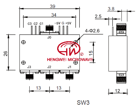 型號 | 頻率范圍(GHz) | 插損(dB.Typ) | 隔離 (dB.Min) | 駐波 (Max) | 輸入功率 (W.Max) | 開關時間(ns) | 電源@ +5V/-5V DC(mA.Typ) | 外形尺寸 | RoHS |