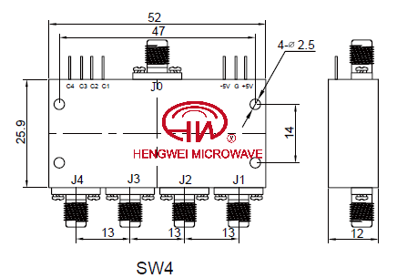 型號 | 頻率范圍(GHz) | 插損(dB.Typ) | 隔離(dB.Min) | 駐波(Max) | 輸入功率(W.Max) | 開關時間(ns) | 電源@ +5V/-5V DC(mA.Typ) | 外形尺寸 | RoHS |